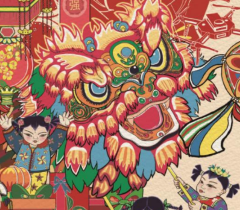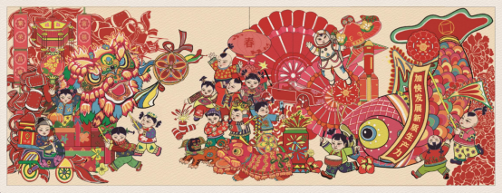 《欢腾盛世歌》是一幅融合传统与创新的年画作品,以舞狮、放炮、游行等春节经典场景为主题,生动展现节日的热闹与欢庆。画面采用对称构图,运用鲜艳色彩和浓郁的装饰风格,将中国传统文化意境与现代设计巧妙结合,呈现出一幅繁荣昌盛的盛世图景,寄托对幸福生活的美好祝愿,传递浓厚的节日氛围和社会发展的积极能量。
