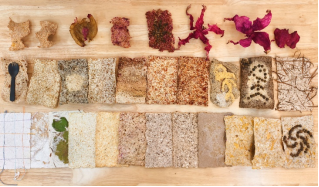 另一位材料试验创作者则用纸浆、废报纸、废快递纸板创作出一系列绘画和雕塑作品。创作者利用回收纸进行纸浆处理,通过搅拌、浸泡等方式将废纸转化为可用的纸浆。将日常生活中随处可见的纸转化为随处可见的“日常物品”。创作者在创作《倒述(树)》这一作品时,使用了废纸板、报纸、复印纸等材料,进行纸的本质还原。树可生纸,纸亦可造“树”。