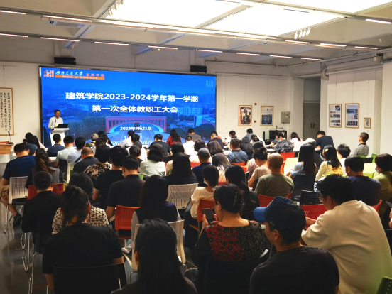 2023年9月21日下午,建筑学院在犀浦校区8号教学楼美术馆召开了2023-2024学年第一学期第一次全院教职工大会,开展科学家精神学习及师德师风专题教育,并部署本学期工作。执行院长沈中伟,党委副书记刘一杰,副院长崔叙、杨青娟,学院助理刘春尧、张樱子、付飞、于洋等学院领导,以及学院全体教职工和部分学生代表参加了此次会议。会议由学院党委书记胡伟主持。