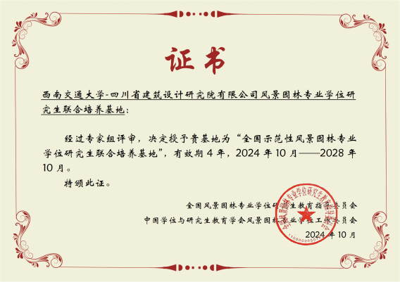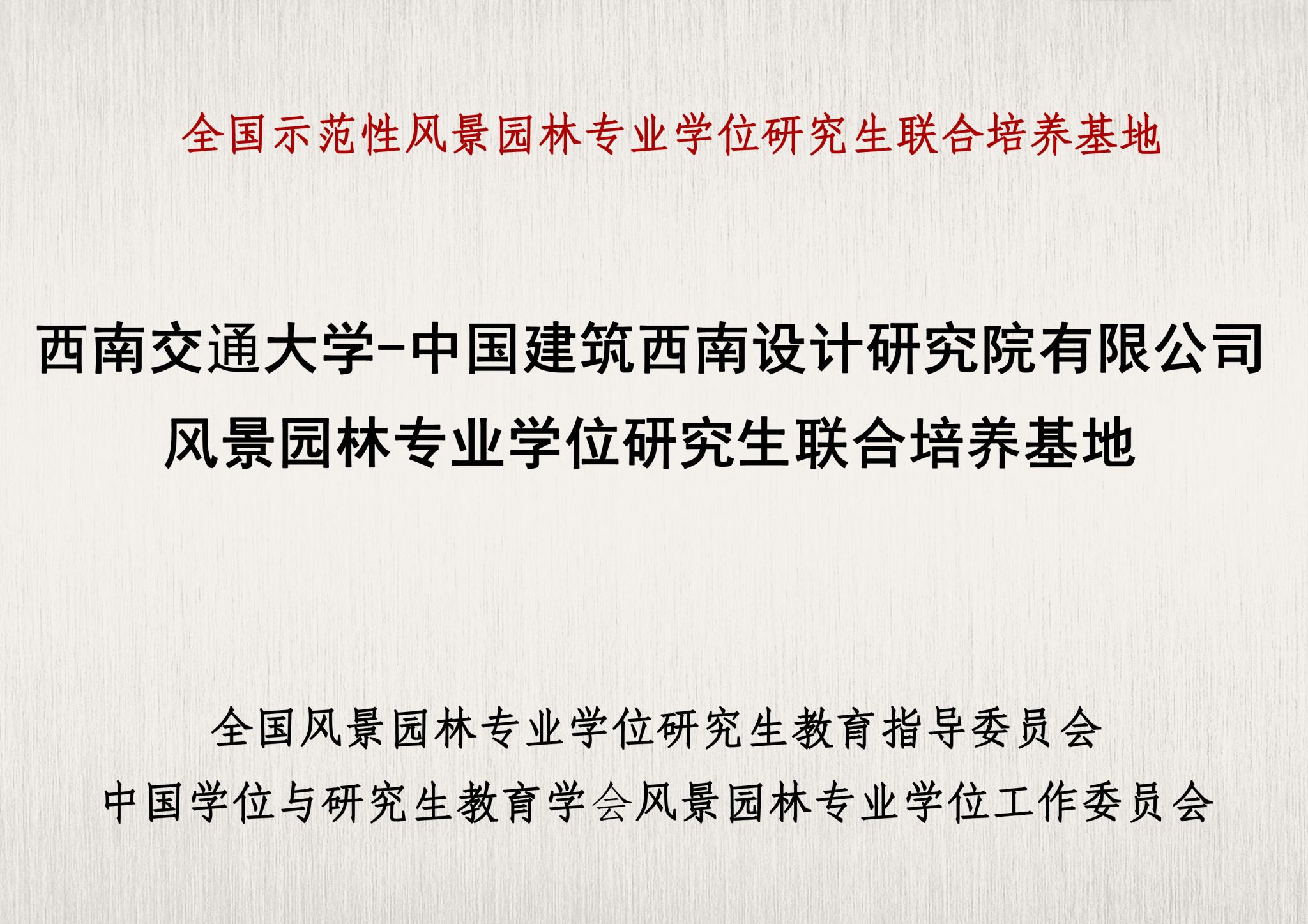 10月27日,在全国风景园林专业学位研究生教育年会上,全国示范性风景园林专业学位研究生联合培养基地名单正式揭晓。经过专家组严格考核评选,获批十家全国示范基地。“西南交通大学-中国建筑西南设计研究院有限公司风景园林专业学位研究生联合培养基地”与“西南交通大学-四川省建筑设计研究院有限公司风景园林专业学位研究生联合培养基地”分获新增与复核通过!至此全校拥有此类研究生联合培养基地达到3个。