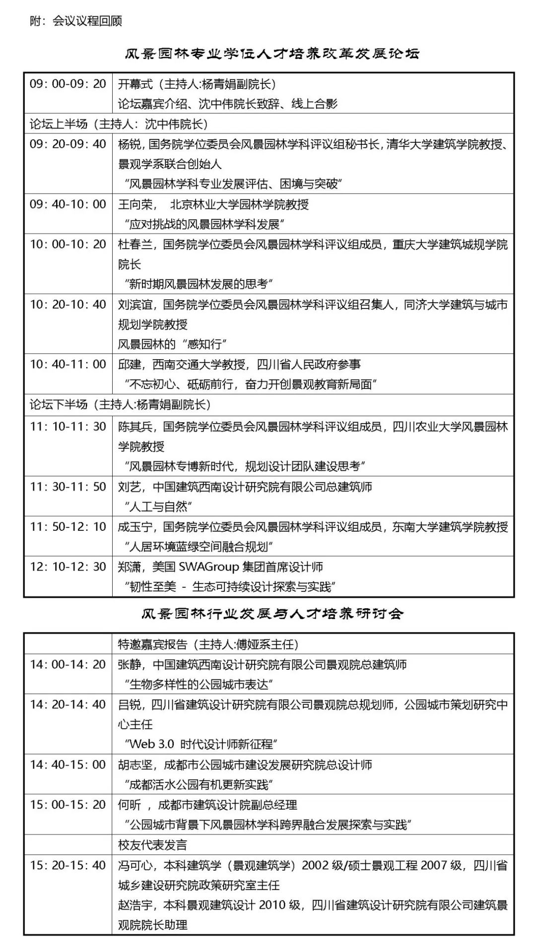 本次论坛特别邀请的8位来自各大高校和设计院的专家学者,包括国务院学位委员会风景园林学科评议组秘书长,清华大学建筑学院景观学系联合创始人杨锐教授,国务院学位委员会风景园林学科评议组召集人,同济大学建筑与城市规划学院刘滨谊教授,国务院学位委员会风景园林学科评议组成员,东南大学建筑学院教授成玉宁教授,国务院学位委员会风景园林学科评议组成员,重庆大学建筑城规学院杜春兰院长,国务院学位委员会风景园林学科评议组成员、四川农业大学陈其兵教授,四川省人民政府参事,西南交通大学邱建教授,中国建筑西南设计研究院有限公司总建筑师刘艺和美国SWAGroup集团首席设计师郑潇女士。专家们的精彩报告为百年未有之大变局时期的风景园林专业发展及人才培养方向提供了深度的思考与启发。