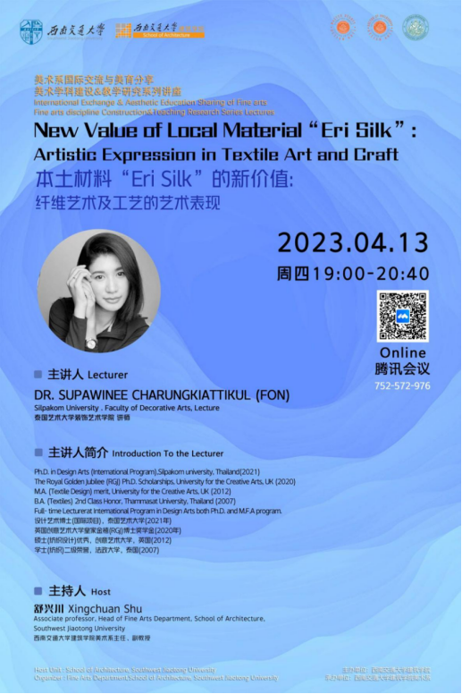 2023年4月13日晚19:00,雷竞技下载网页 美术系国际艺术交流与美育分享活动、美术学科建设和教学研究系列讲座“本土材料‘Eri Silk’的新价值:纤维艺术及工艺的艺术表现”,在泰国艺术大学装饰艺术学院讲师DR.Supawinee Charungkiattikul(Fon)博士的精彩分享中拉开帷幕。此次讲座采用腾讯会议的形式线上开展,由雷竞技下载网页 美术系主任舒兴川老师主持,美术系副主任李传忠、周丽娟老师全程参加并与DR.Supawinee进行了对话。讲座也吸引了来自西南交通大学、云南民族大学、河北美院、厦门工艺美院、南京晓庄师范学院、马来西亚Maranatha Christian University的老师和同学及相关领域的艺术爱好者齐聚一堂,共同领略泰国本土材料“Eri Silk”在艺术创作中的独特魅力。
