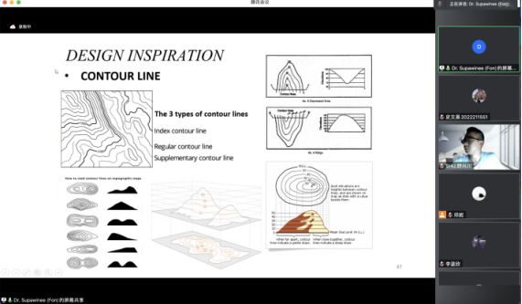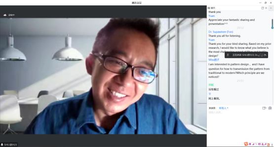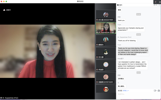 在讲座的最后,Dr.Supawinee通过她的纤维艺术作品向我们展示了泰国当代纺织艺术和工艺美学知识,并诠释了泰国本土材料“Eri Silk”的新价值。在提问环节,老师对于同学们所提出的“传统丝织材料和Eri Silk材料有哪些不同?”“在以后的创作中有可能用到如今的人造纤维材料或者化学材料呢?”“从可持续角度考虑,Eri Silk材料可否加入再生纺线,比如一些被遗弃的纺织品再加工,为环保做贡献呢?”等问题都做了十分详细的解答。