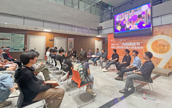 5月5日12点,第九届西南交通大学建造节评奖仪式结束后,本次建造节还组织了成都市建筑设计研究院设计二院建筑设计骨干徐鸿巍,设计三院建筑设计骨干庞春林,方案创作中心建筑设计骨干孙鸣阳,徐尚云工作室建筑设计骨干唐逸聪等4位青年建筑师与建筑学院建筑系常务副系主任祝莹老师、副系主任熊瑛、专业教师万江、曹勇、张宇老师及参加本次建造节的师生聚集在建筑学院中庭,面对面的交流此次天府建造节的感悟与收获。座谈会上,青年建筑师们的发言热情洋溢,同学们踊跃提问、积极聆听一线建筑师的建议和经验,整个座谈会获得圆满成功。